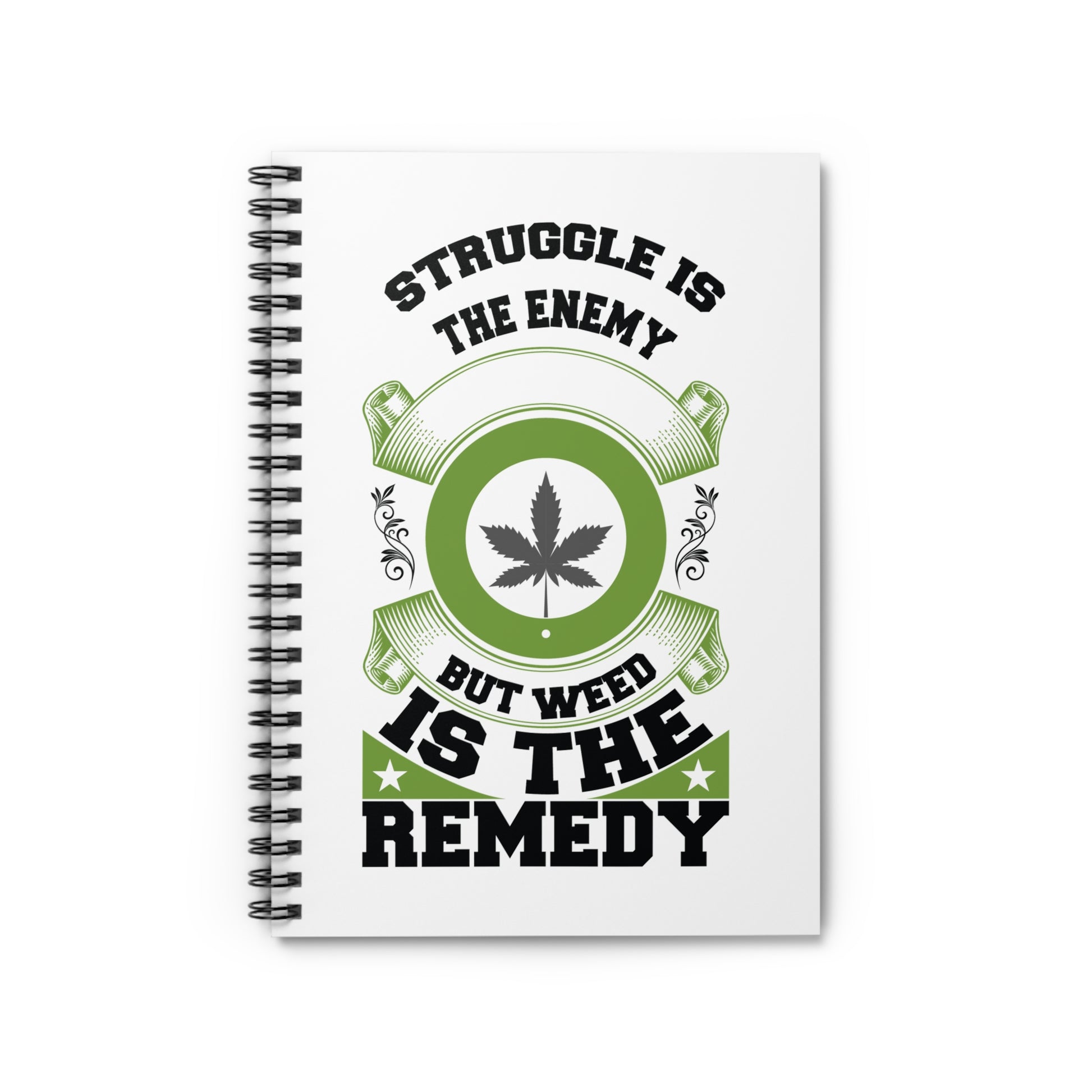 Unleash your creativity and jot down your thoughts with this stylish spiral notebook. Featuring a bold, eye-catching design that reads "Struggle is the Enemy, But Weed is The Remedy," this notebook adds a vibrant touch to your writing routine. It's perfect for artists, students, or anyone who loves to express themselves on paper. The metal spiral binding allows for easy page turning, making it a fantastic companion for daily journaling or jotting down inspiration. With a document pocket for extra storage, you can keep all your important notes in one place. Ideal for anyone who celebrates individuality and creativity, this notebook makes a thoughtful gift for holidays like 4/20, birthdays, or just as a delightful treat for yourself.